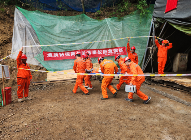 演練模擬在ZK8鉆孔施工中,一名高處作業(yè)人員因鉆塔操作平臺鋪板不規(guī)范、未正確系掛安全帶,導致失足高處墜落。事故發(fā)生后,項目部立即啟動應急預案,按照響應程序組織醫(yī)療救援小組、現(xiàn)場處置小組、后勤保障小組攜帶擔架、醫(yī)藥箱等救援器材趕赴現(xiàn)場實施救援。