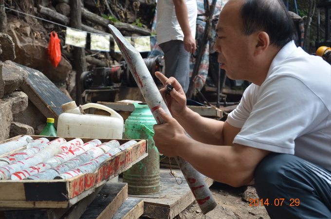 該項目是我隊繼小秦嶺整裝勘查潼關自有礦權區中深部探礦系統工程之后的又一探礦項目。在總公司領導的關心支持下,隊主要領導非常重視,多次前往項目實施地進行現場檢查指導。目前,項目相關手續辦理及鉆探施工正有序進行,總體進展順利,鉆孔不同深度見有多層礦化。在檢查ZK503提取的巖心時,王隊長手持地質放大鏡仔細查看,他要求施工和相關技術人員要隨時注意巖心變化情況,特別對不同標高段出現的不同地質情況要認真記錄、仔細分析、及時報告,不能漏掉任何細節。