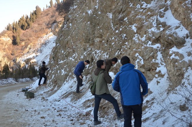 驪山梁上積雪未消,隊(duì)員們冒著零下3℃的低溫認(rèn)真的測(cè)量地質(zhì)剖面。他們分工明確,有人拉皮尺,有人定巖性,有人管記錄。寒風(fēng)吹過(guò)參賽隊(duì)員的臉頰,他們毫無(wú)知覺(jué),一心一意專注于比賽之中。擂臺(tái)之上比速度,實(shí)戰(zhàn)之中看技能,這樣的比賽場(chǎng)面,也展示著地質(zhì)隊(duì)員精益求精的工作態(tài)度。