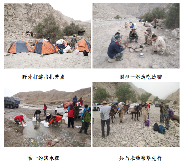 由于工區(qū)面積較大,采樣難度因地形所限超乎預(yù)期,許多地方不能當天返回駐地,我們只能采用“打游擊”(騾子馱帳篷,走哪住哪)的方式進行。于是茫茫阿爾金山便是我們的床,浪漫星空便是我們的被,與阿爾金山野驢為伴,別說還真有點野性。然而吃飯卻是最大的問題,自帶的淡水僅能維持兩日,后面的日子就只能用燒開的咸水煮方便面、下掛面,或者索性用馕充饑。為了能按時完成任務(wù),項目人員餐風(fēng)沐雨,齊心協(xié)力,從不叫苦。